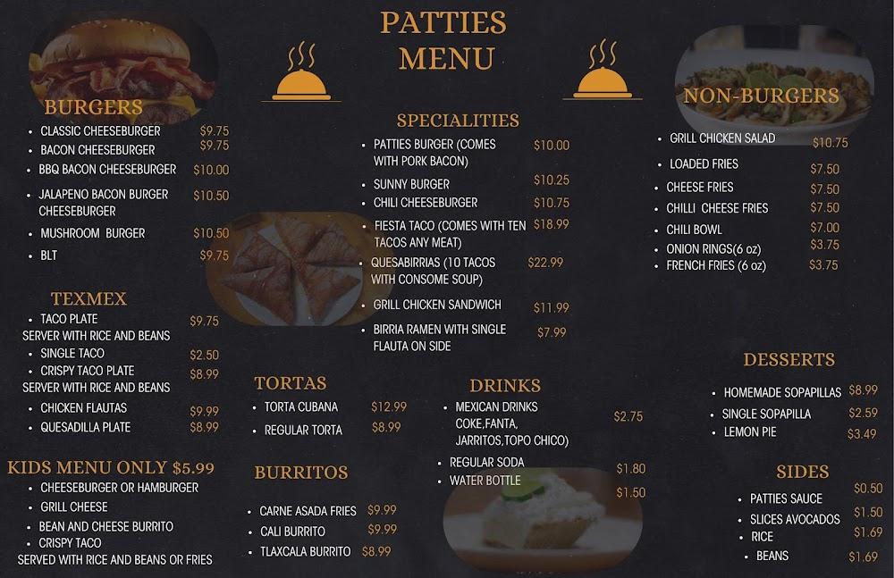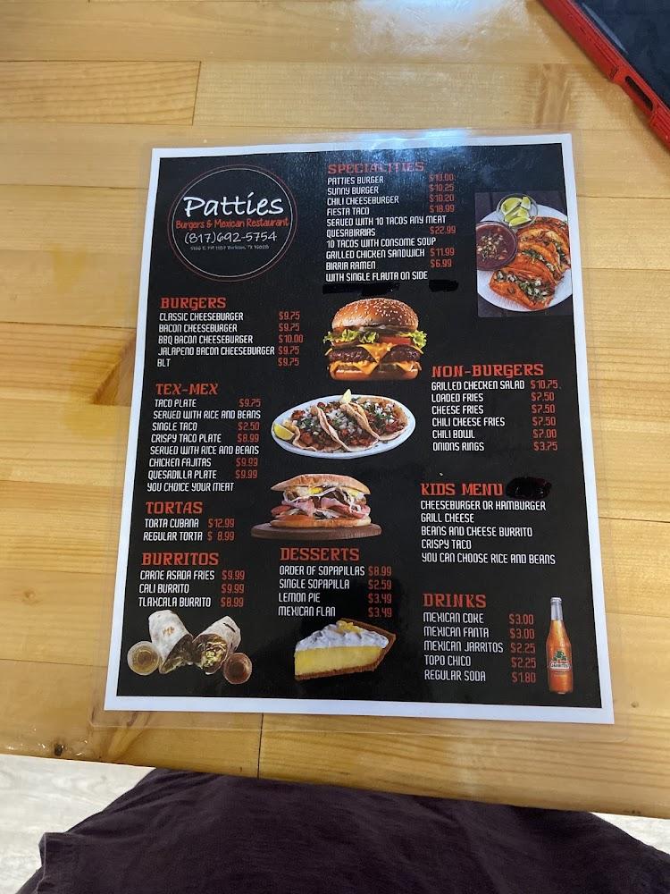 Discover Patties Burgers and Mexican Restaurant, a culinary gem in Burleson, TX, established in 2019. Indulge in our mouthwatering burgers made from 100% Angus beef, never frozen, alongside a vibrant selection of authentic Mexican dishes. Whether you're craving a hearty breakfast, lunch, or dinner, we cater to all tastes with our dedication to quality and flavor. Enjoy a cozy dining experience with swift service, or opt for convenient takeout and delivery. Our accessible facilities ensure everyone can savor delicious food in a welcoming atmosphere. Join us at 5166 E FM1187 for a tantalizing adventure that delights every palate!